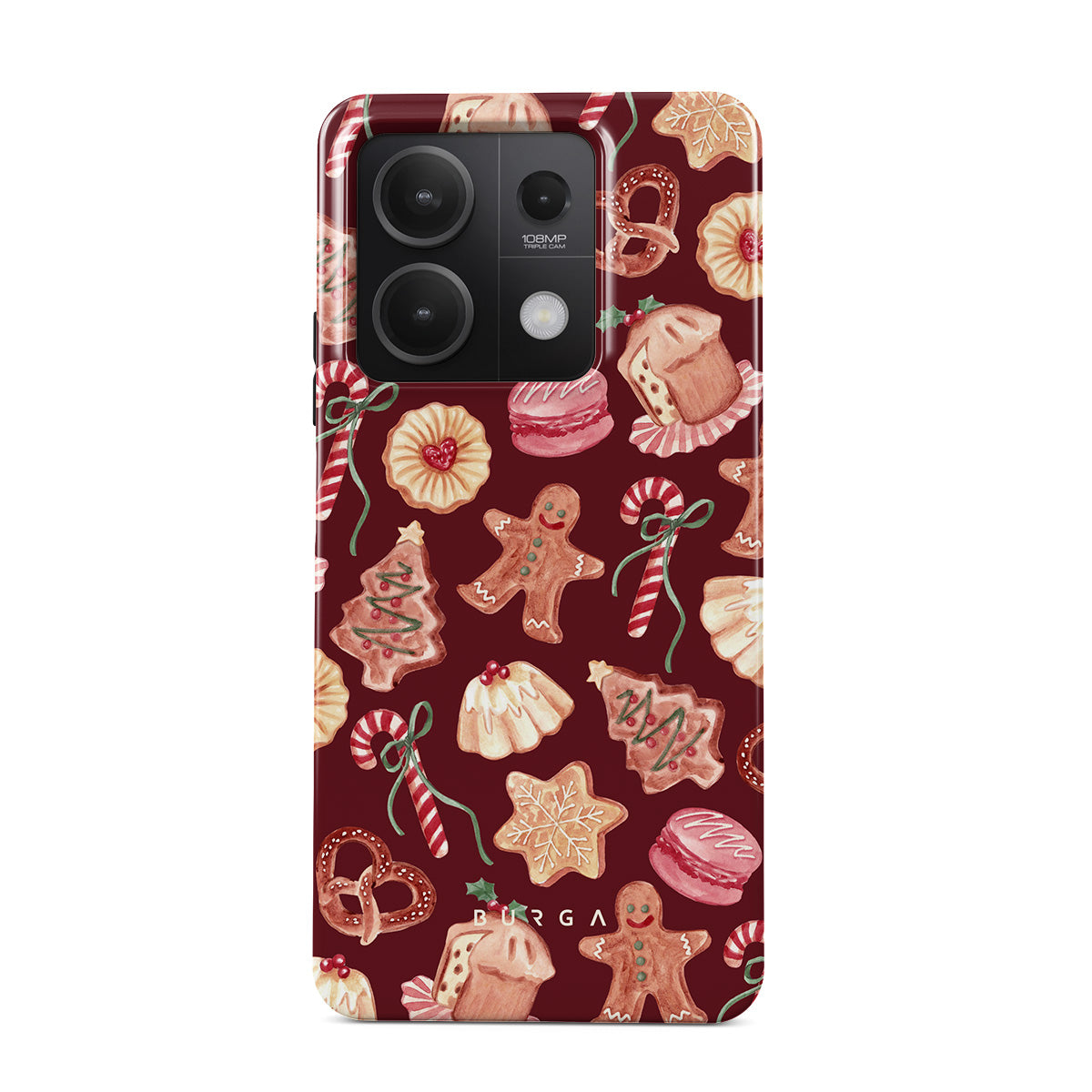 En este diseño: galletas de Navidad, hombres de jengibre, bastones de caramelo, caramelos de menta, dulces festivos, fondo rojo burdeos