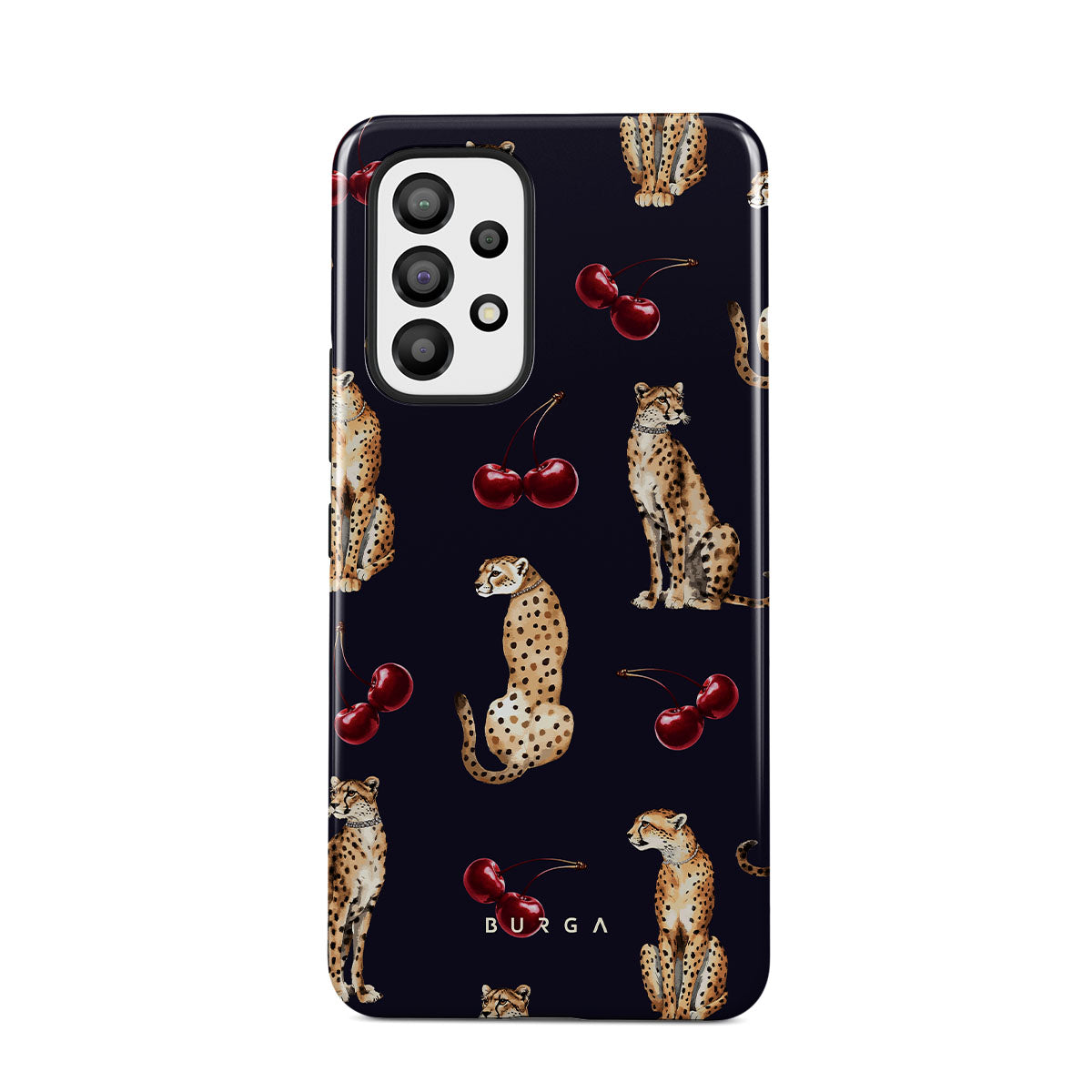Este diseño presenta: estampado de leopardo, leopardos, cerezas.