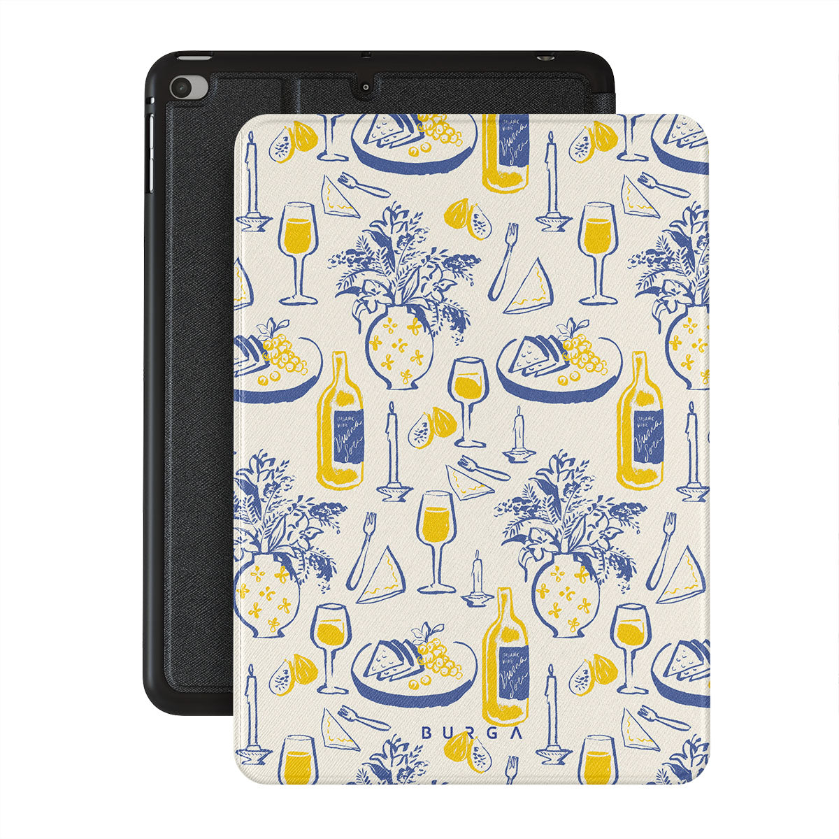 En este diseño: botellas de vino, flores, plato de quesos, velas, utensilios, limonada