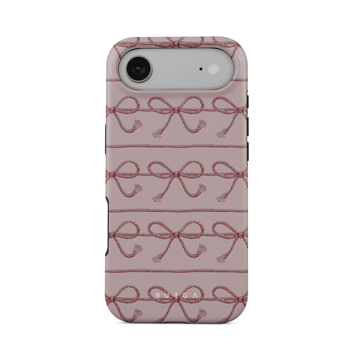 En este diseño: moños rosas, fondo rosa, cuerdas, estampado divertido.
