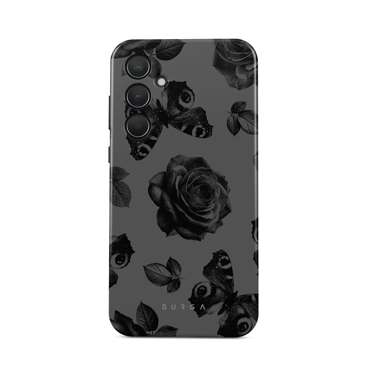 En este diseño: rosas negras, flores góticas, sombras tenebrosas.