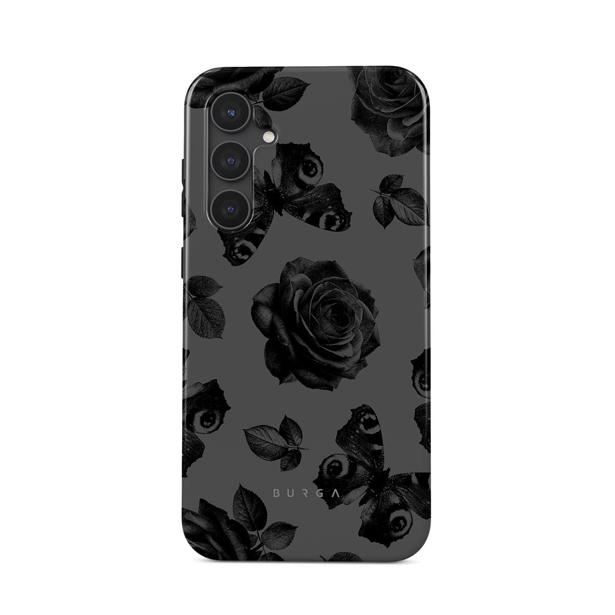 En este diseño: rosas negras, flores góticas, sombras tenebrosas.