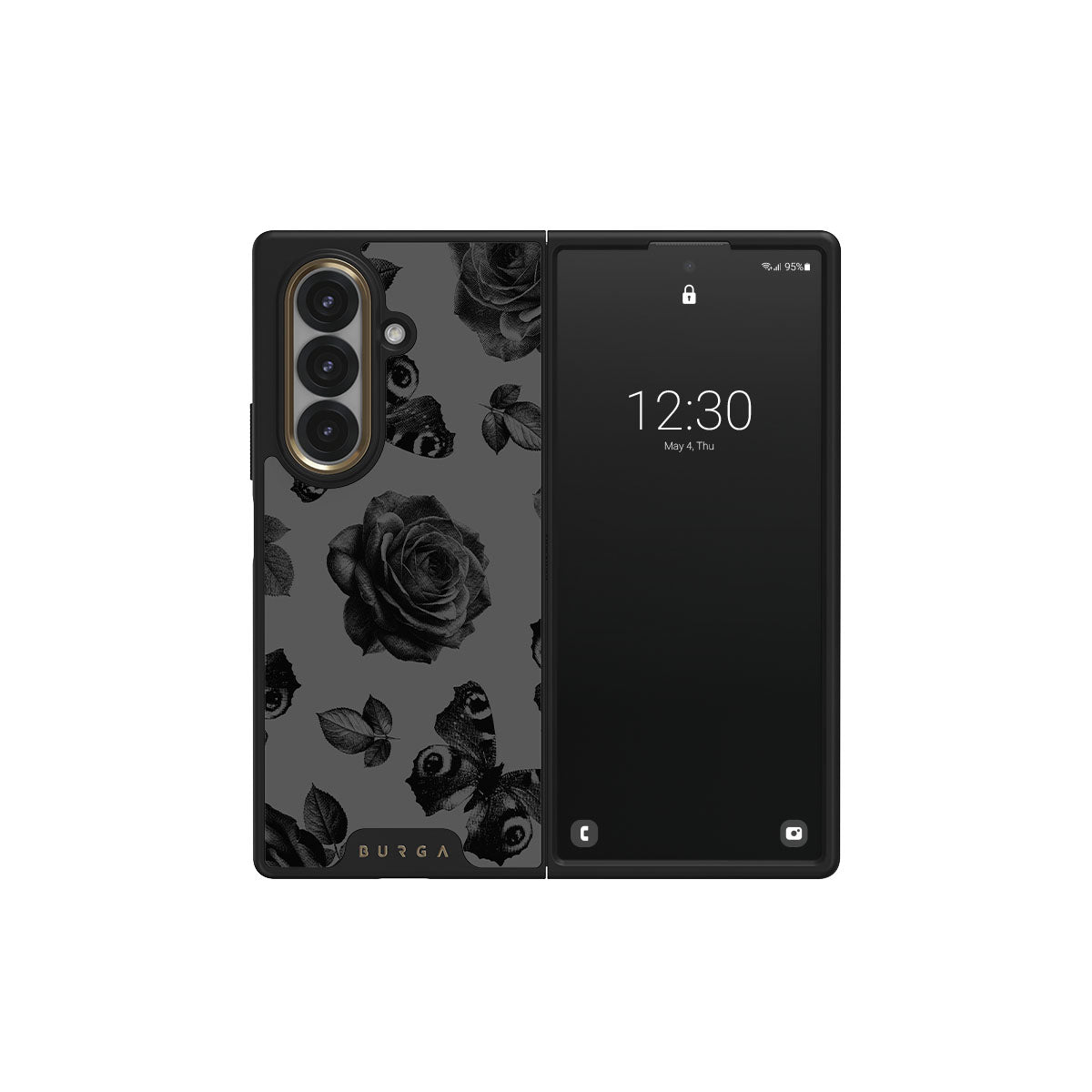 En este diseño: rosas negras, flores góticas, sombras tenebrosas.