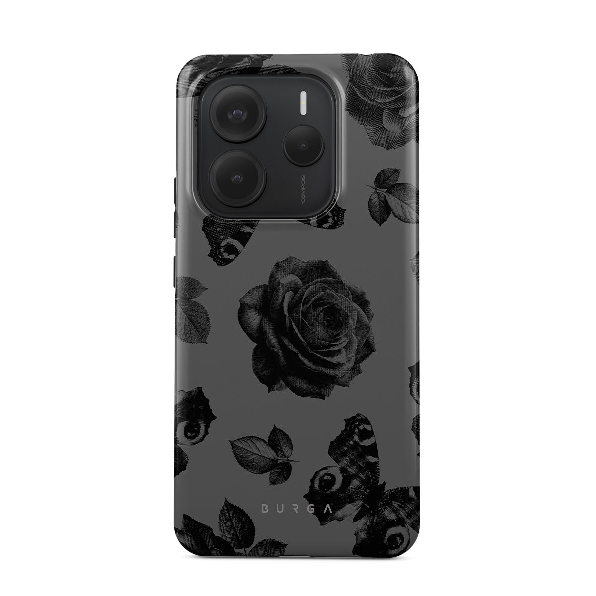 En este diseño: rosas negras, flores góticas, sombras tenebrosas.