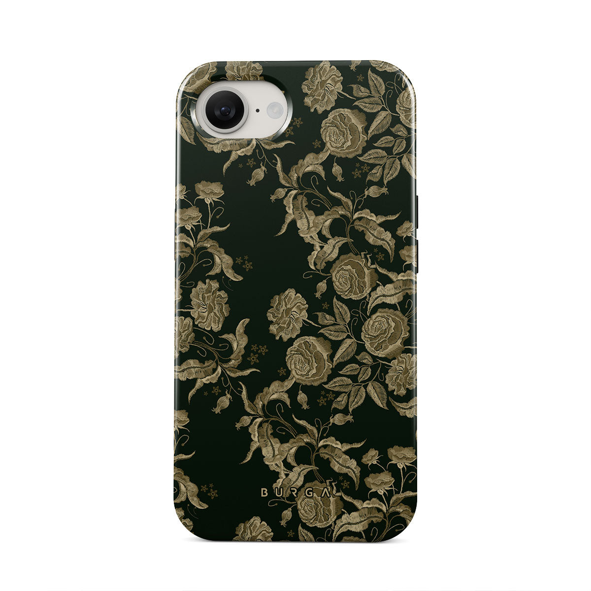 En este diseño: rosas vintage, follaje dorado, tonos verde oscuro.