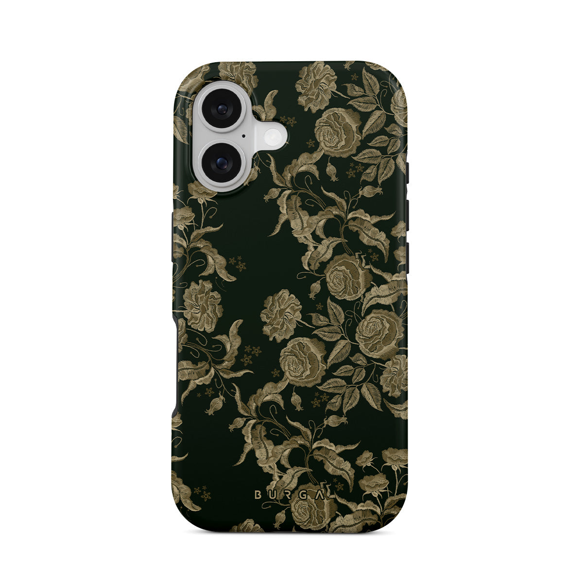 En este diseño: rosas vintage, follaje dorado, tonos verde oscuro.