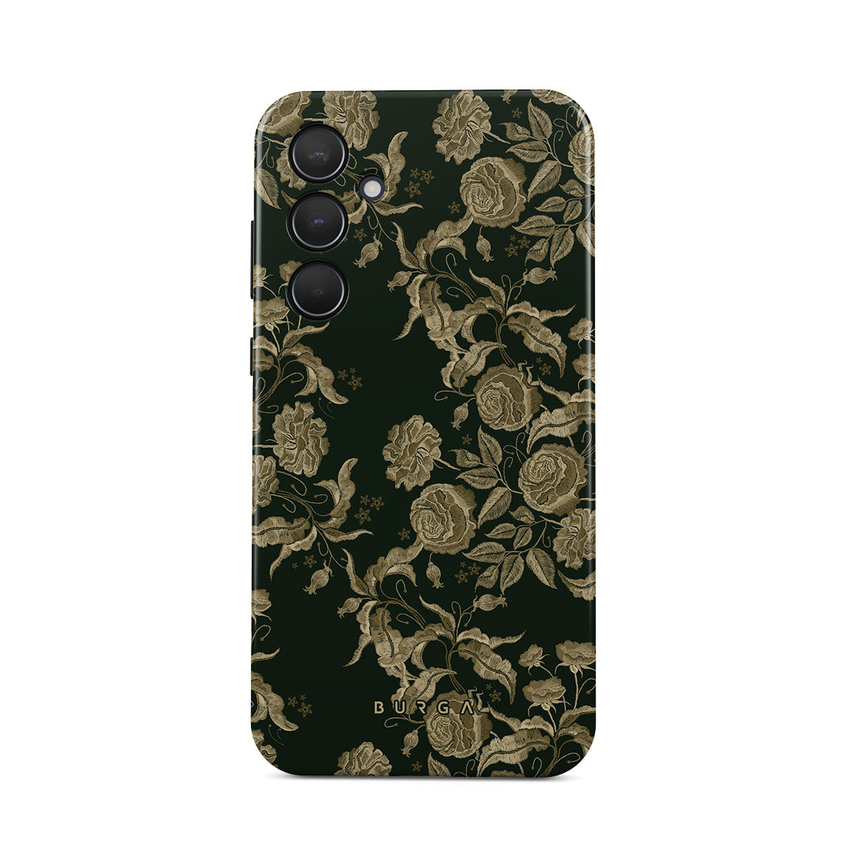 En este diseño: rosas vintage, follaje dorado, tonos verde oscuro.