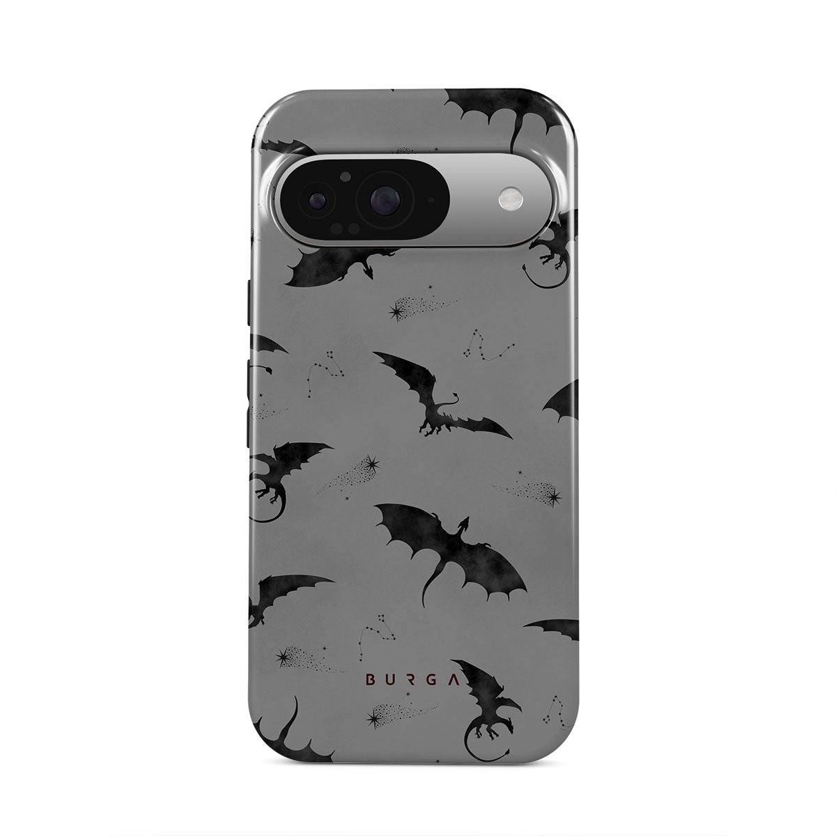 En este diseño: murciélagos, dragones, cielo gris, cielos nocturnos, criaturas siniestras.