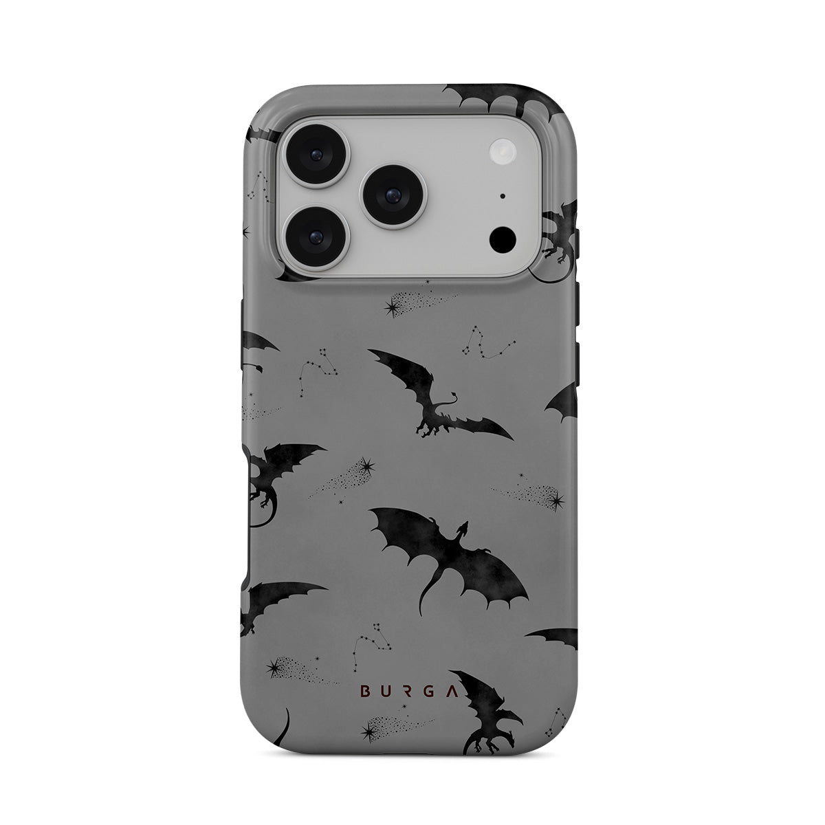 En este diseño: murciélagos, dragones, cielo gris, cielos nocturnos, criaturas siniestras.