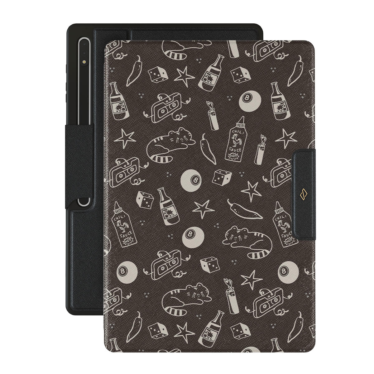 Características de este diseño: fondo marrón, garabatos divertidos, gatos, estrellas, pimienta, dados, bola de billar, cinta de mezclas
