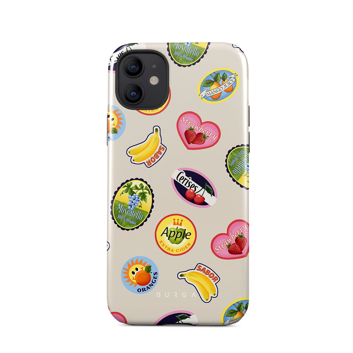 En este diseño: plátanos, estampillas, cerezas, manzanas, naranjas, fresas, colores brillantes, acentos cítricos, motivos de frutas, patrones tropicales.