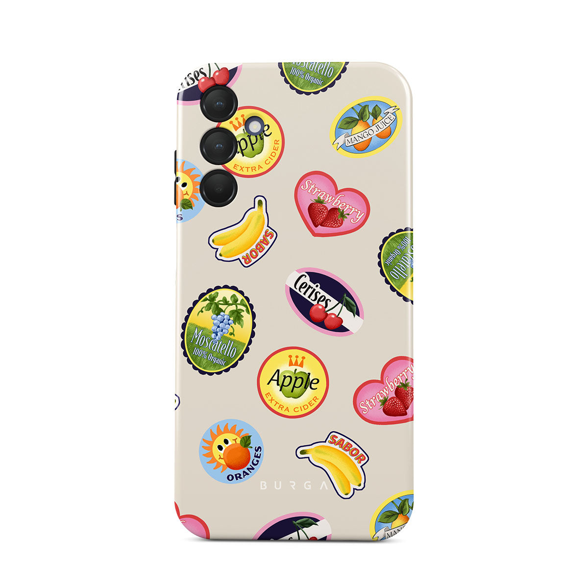 En este diseño: plátanos, estampillas, cerezas, manzanas, naranjas, fresas, colores brillantes, acentos cítricos, motivos de frutas, patrones tropicales.