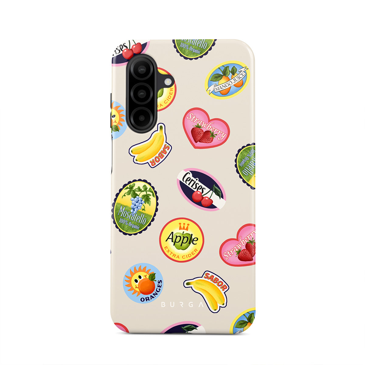 En este diseño: plátanos, estampillas, cerezas, manzanas, naranjas, fresas, colores brillantes, acentos cítricos, motivos de frutas, patrones tropicales.