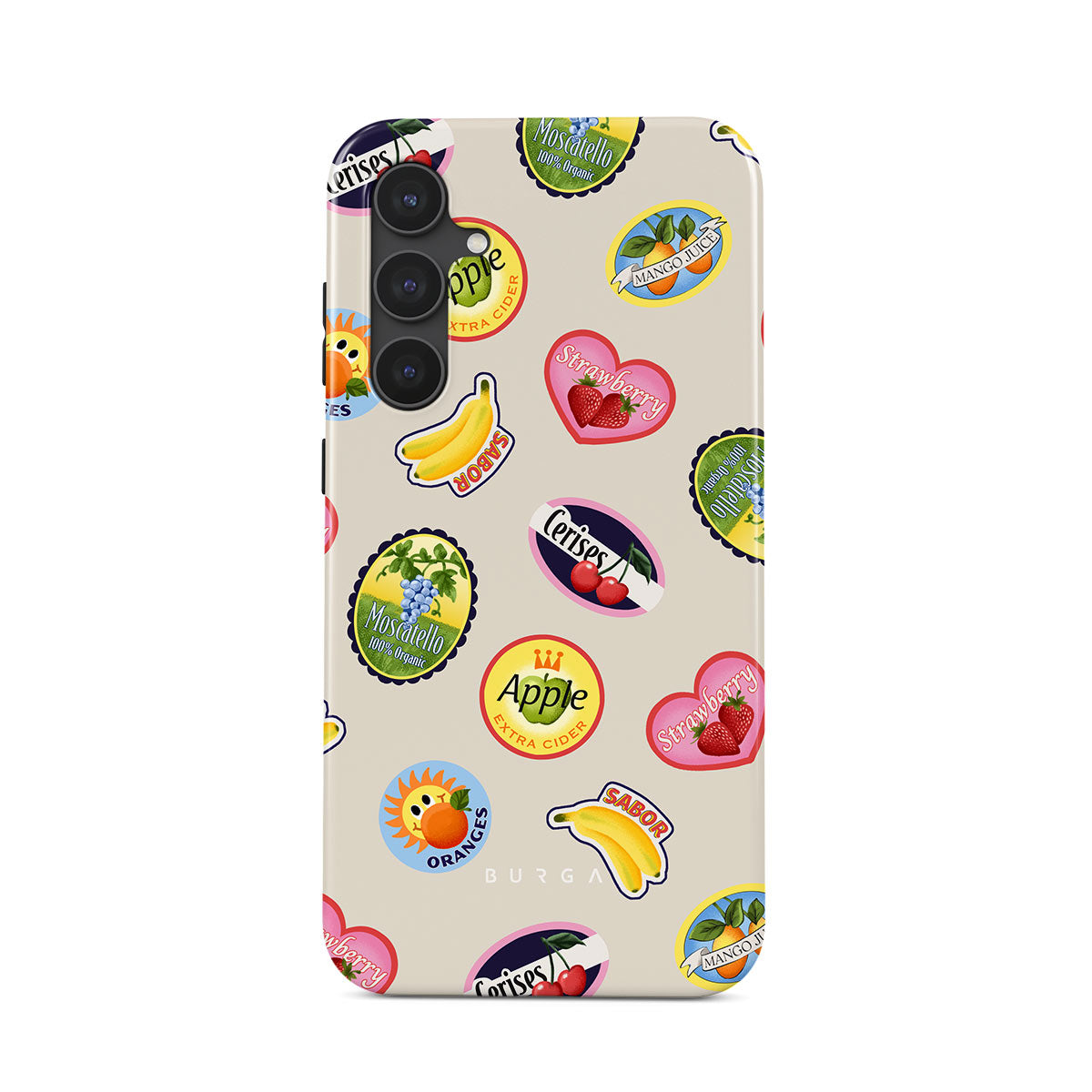 En este diseño: plátanos, estampillas, cerezas, manzanas, naranjas, fresas, colores brillantes, acentos cítricos, motivos de frutas, patrones tropicales.