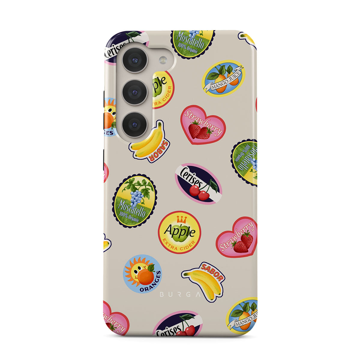 En este diseño: plátanos, estampillas, cerezas, manzanas, naranjas, fresas, colores brillantes, acentos cítricos, motivos de frutas, patrones tropicales.