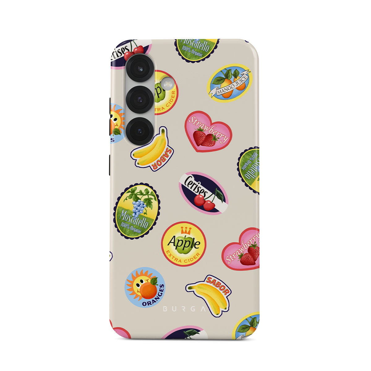 En este diseño: plátanos, estampillas, cerezas, manzanas, naranjas, fresas, colores brillantes, acentos cítricos, motivos de frutas, patrones tropicales.