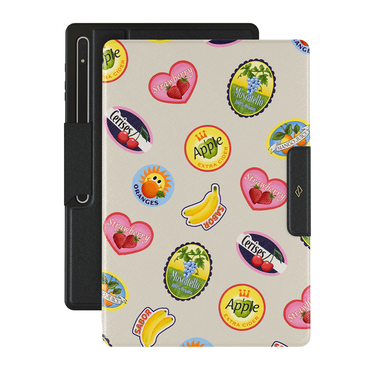 En este diseño: plátanos, estampillas, cerezas, manzanas, naranjas, fresas, colores brillantes, acentos cítricos, motivos de frutas, patrones tropicales.