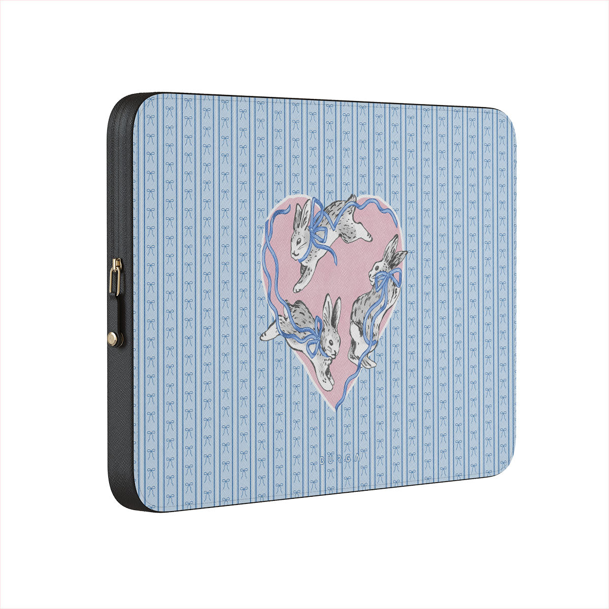 En este diseño: conejos blancos, marco de corazones, rayas azules.