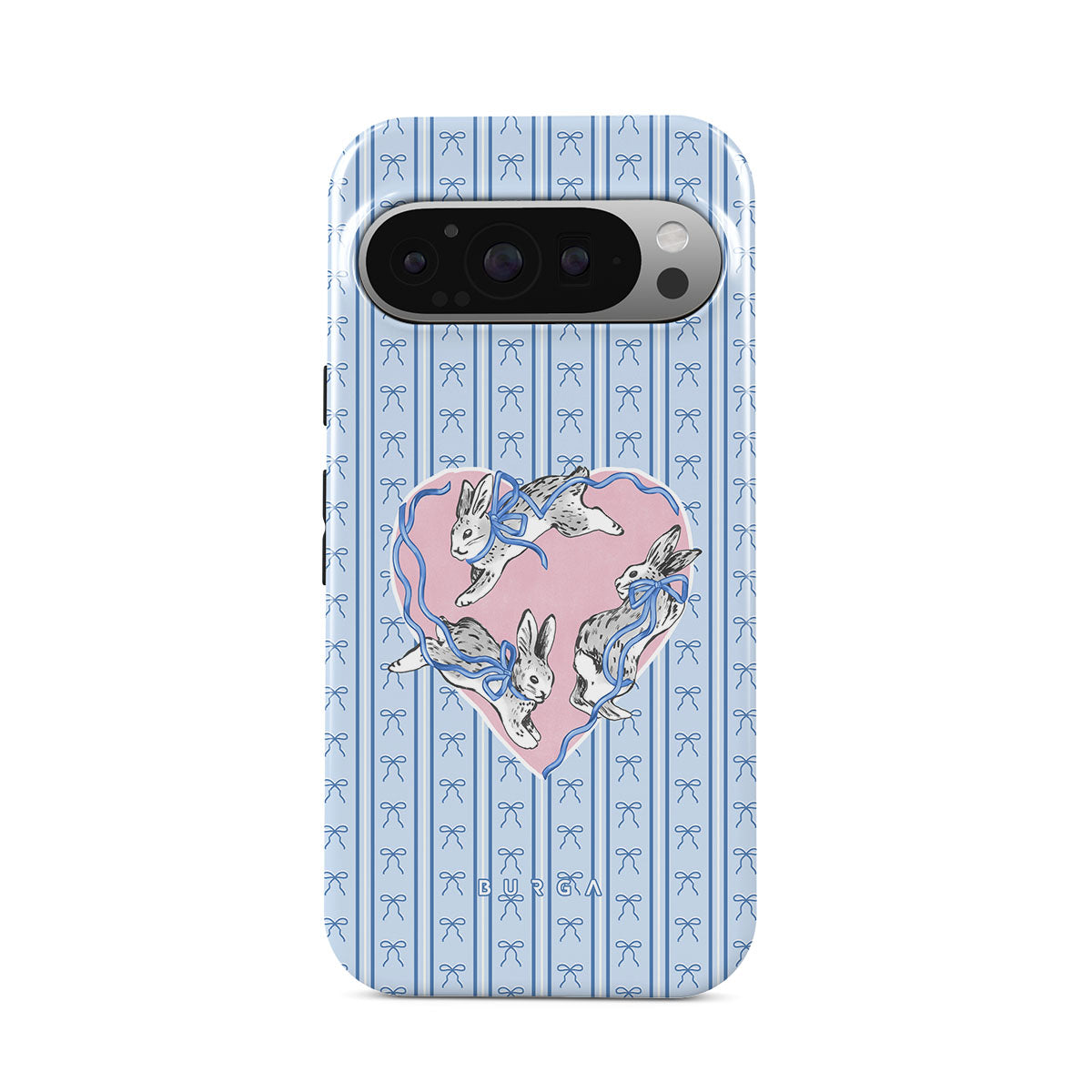 En este diseño: conejos blancos, marco de corazones, rayas azules.