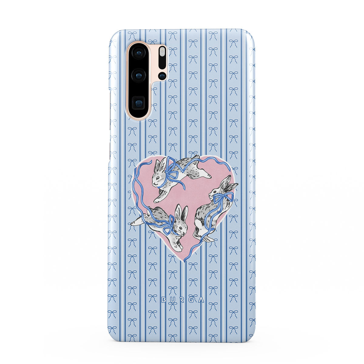 En este diseño: conejos blancos, marco de corazones, rayas azules.