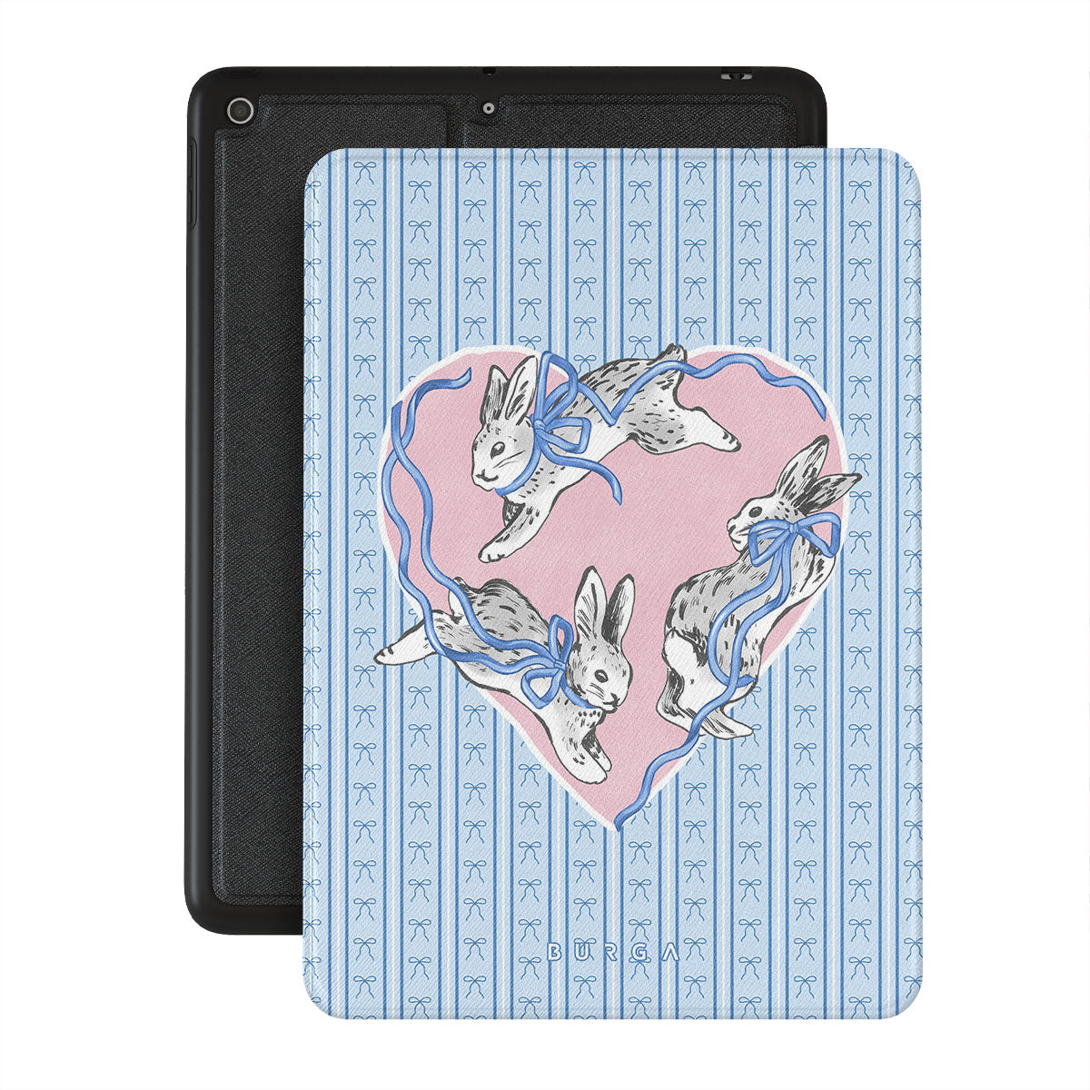 En este diseño: conejos blancos, marco de corazones, rayas azules.