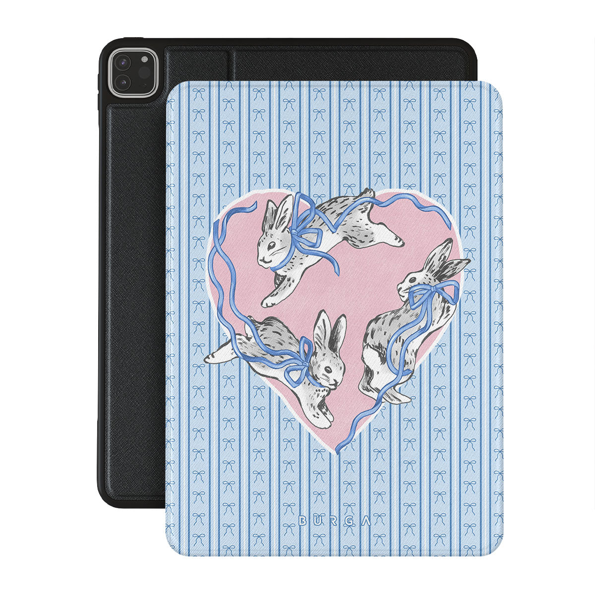 En este diseño: conejos blancos, marco de corazones, rayas azules.