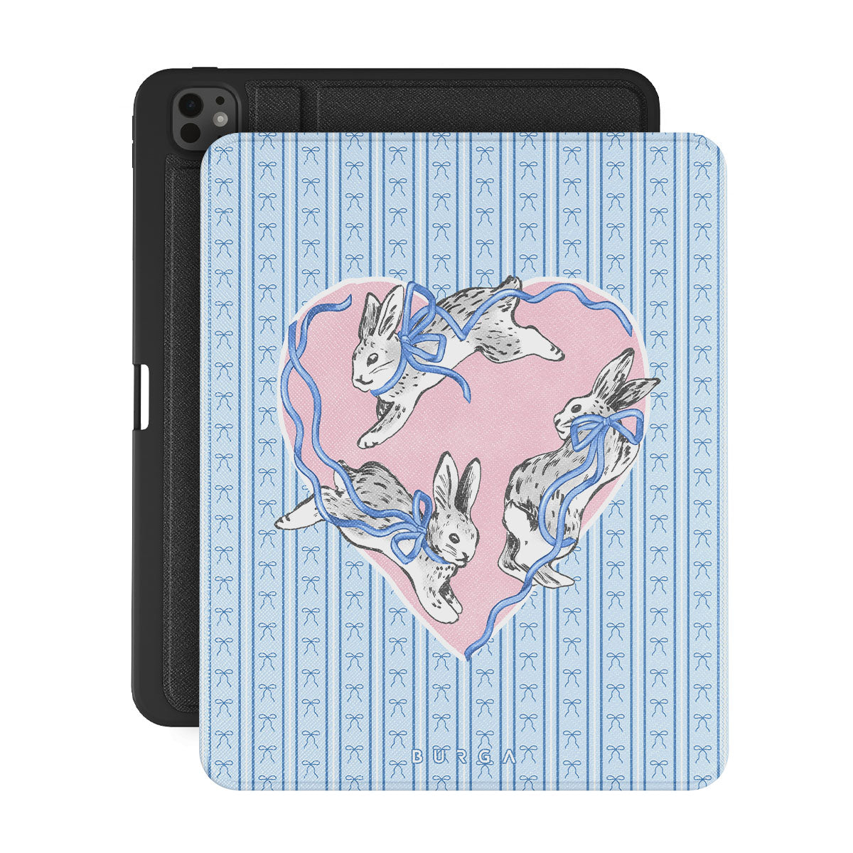 En este diseño: conejos blancos, marco de corazones, rayas azules.