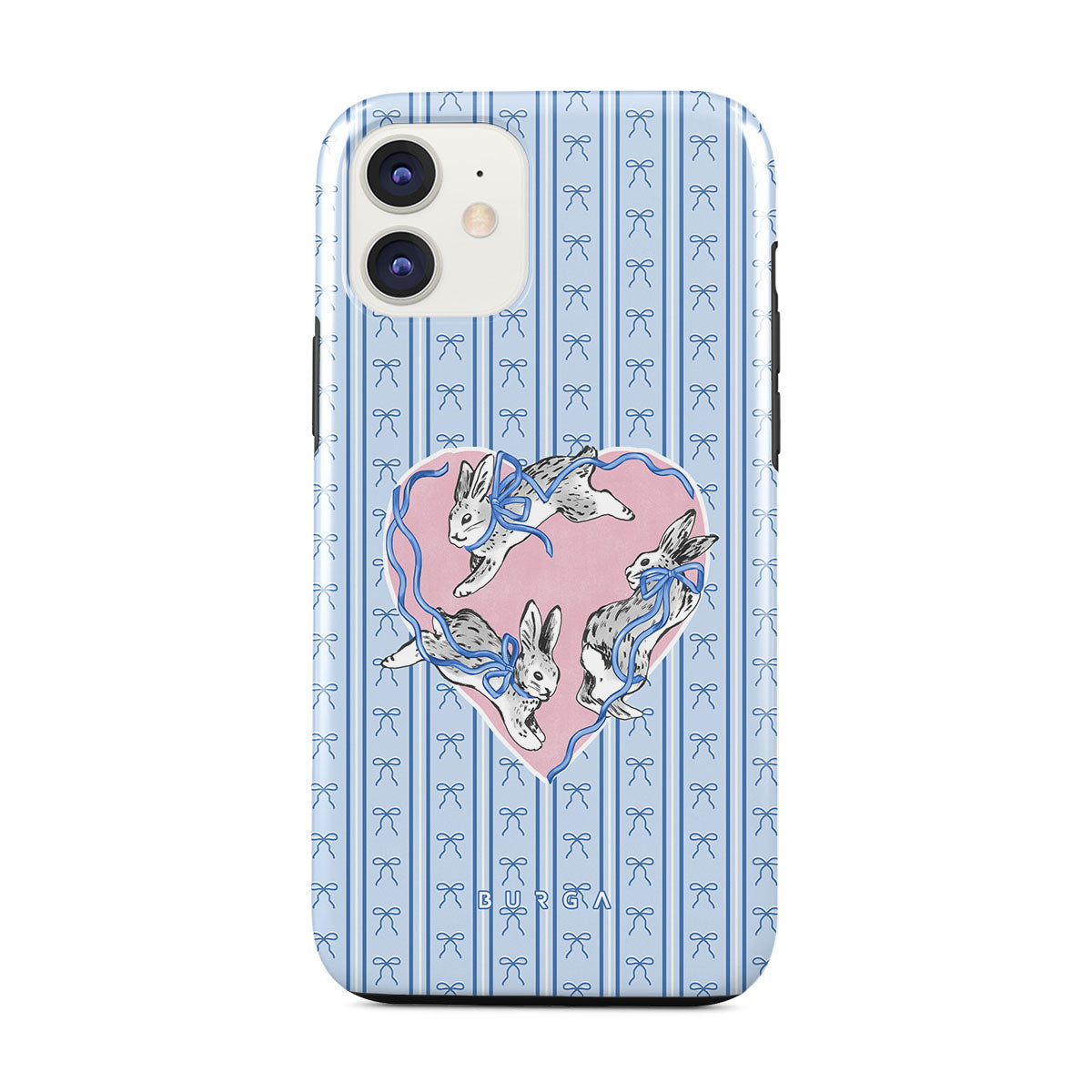 En este diseño: conejos blancos, marco de corazones, rayas azules.