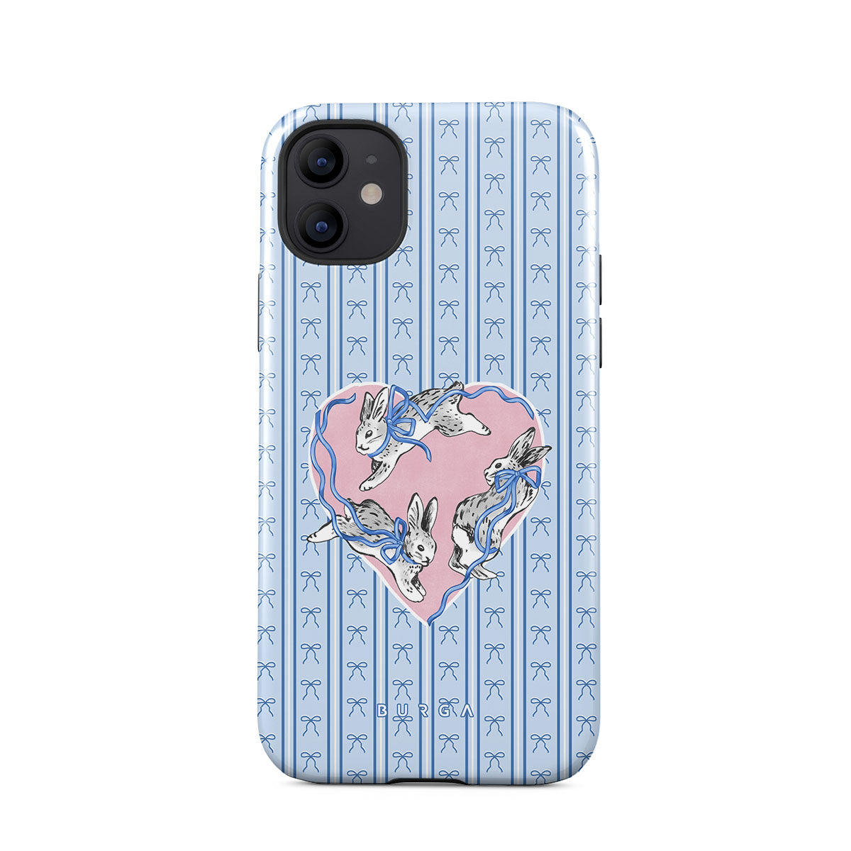 En este diseño: conejos blancos, marco de corazones, rayas azules.