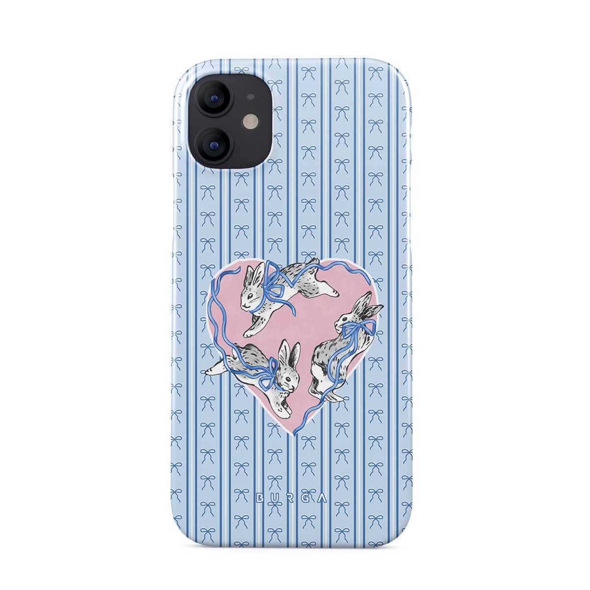 En este diseño: conejos blancos, marco de corazones, rayas azules.