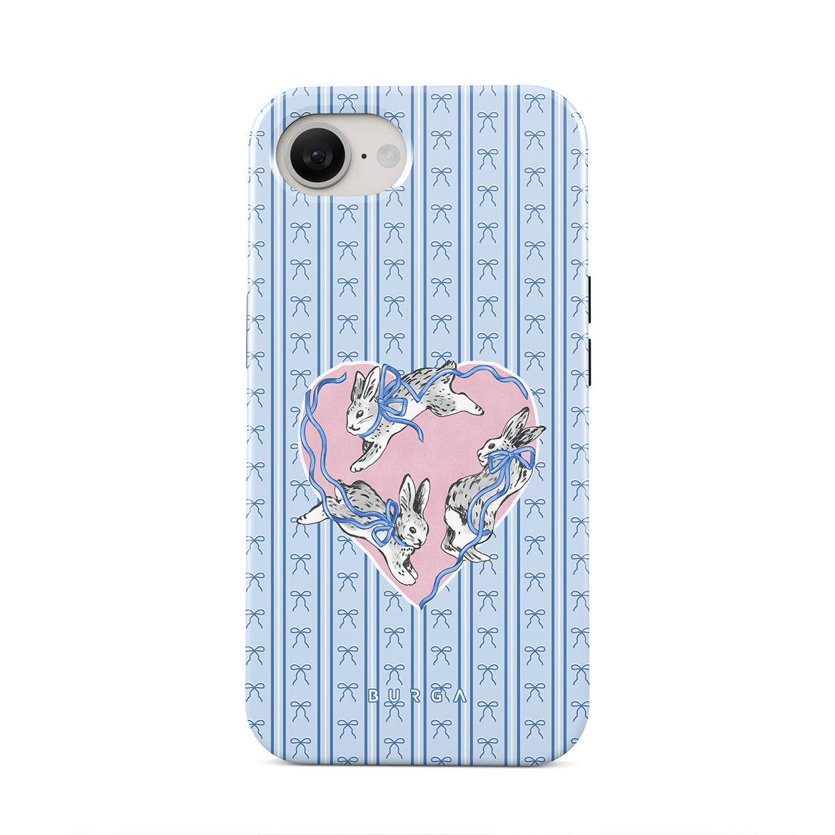 En este diseño: conejos blancos, marco de corazones, rayas azules.
