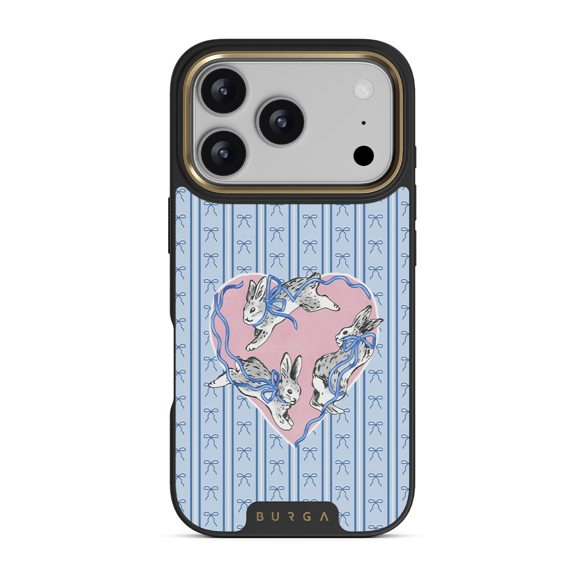 En este diseño: conejos blancos, marco de corazones, rayas azules.