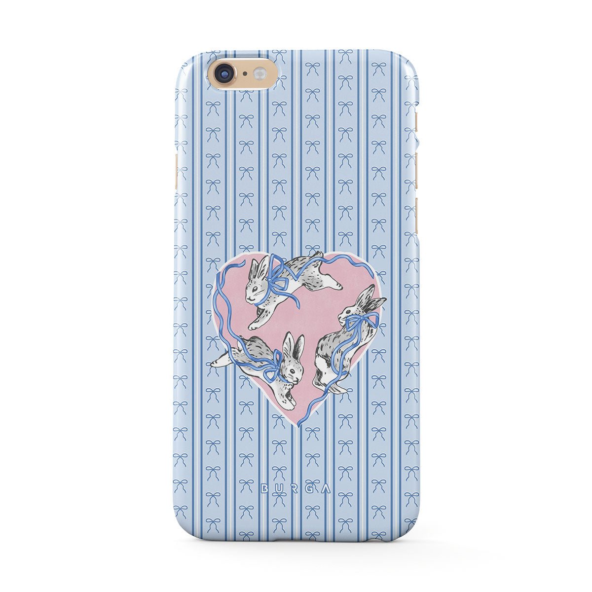 En este diseño: conejos blancos, marco de corazones, rayas azules.