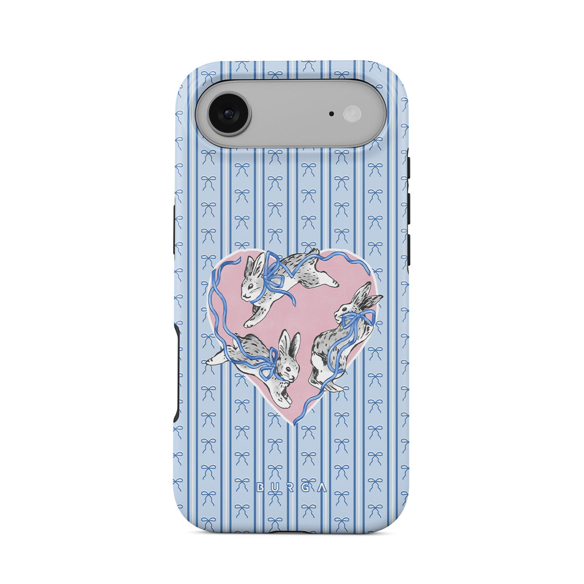 En este diseño: conejos blancos, marco de corazones, rayas azules.