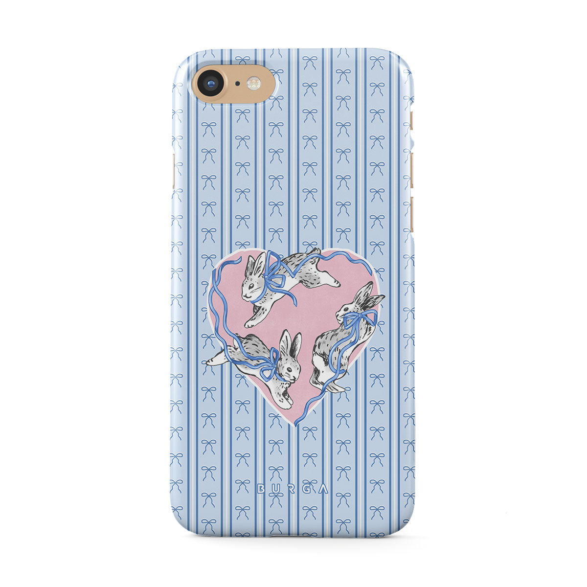 En este diseño: conejos blancos, marco de corazones, rayas azules.