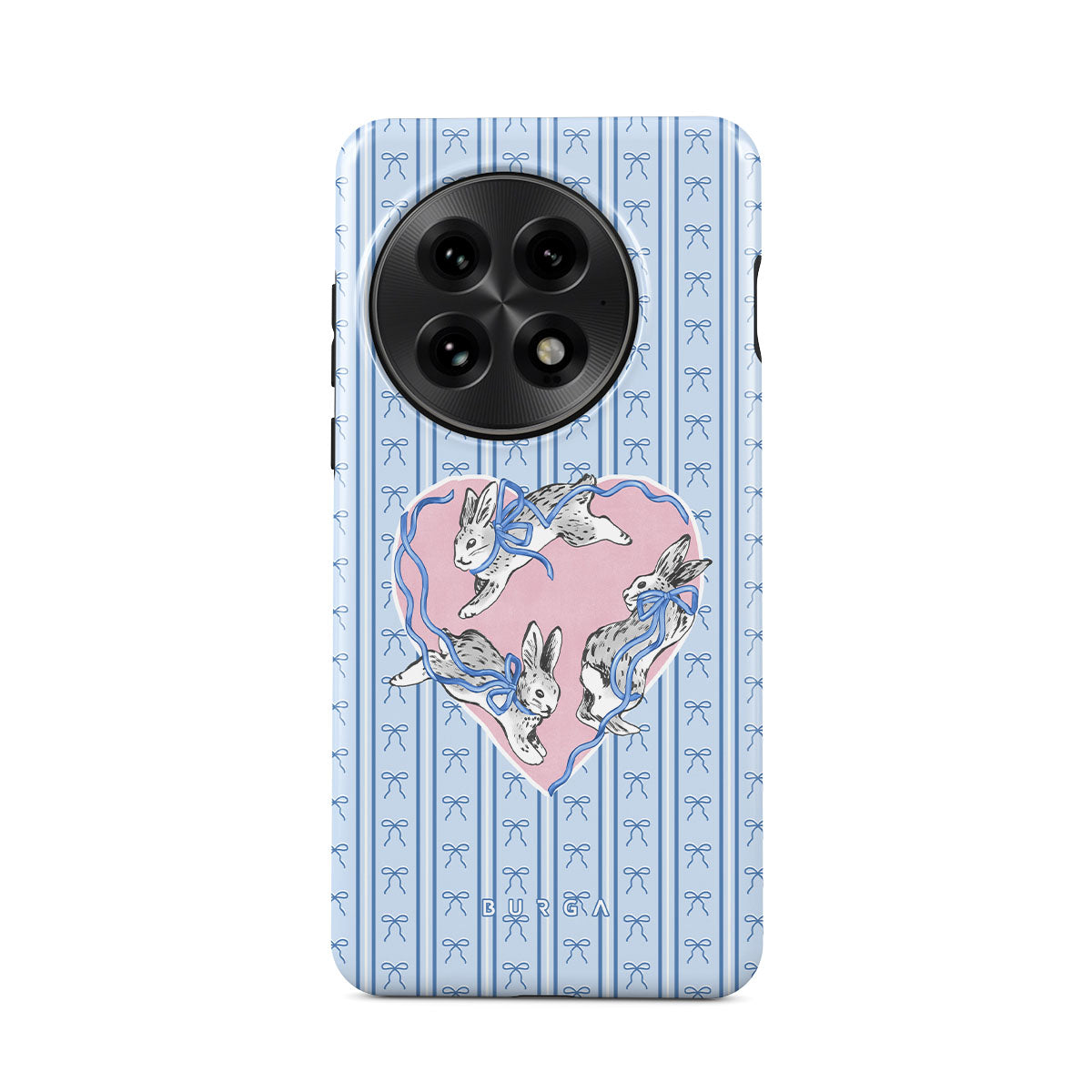 En este diseño: conejos blancos, marco de corazones, rayas azules.