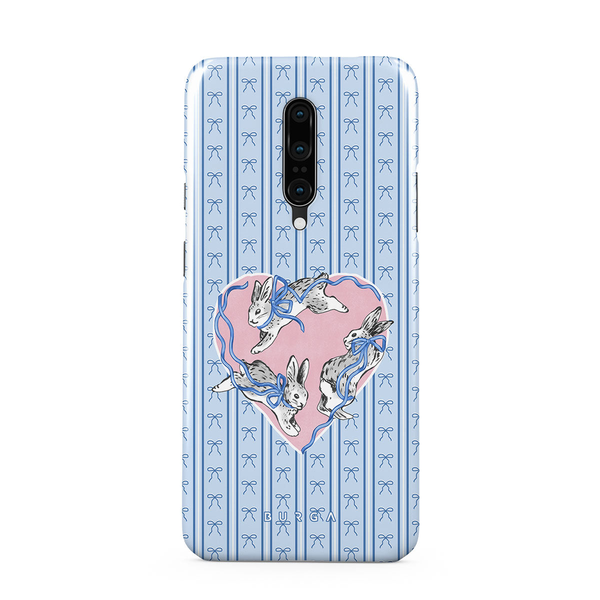 En este diseño: conejos blancos, marco de corazones, rayas azules.