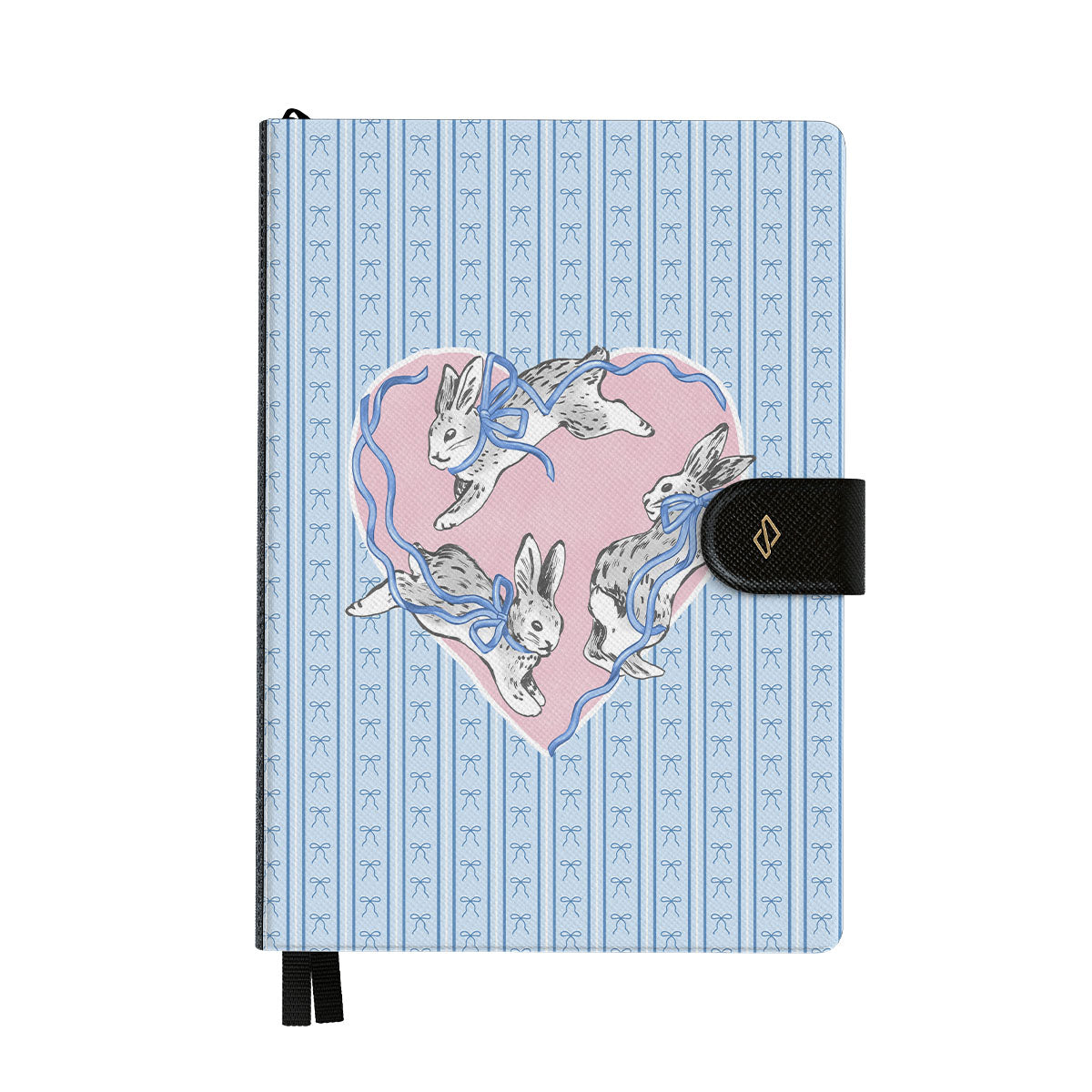 En este diseño: conejos blancos, marco de corazones, rayas azules.