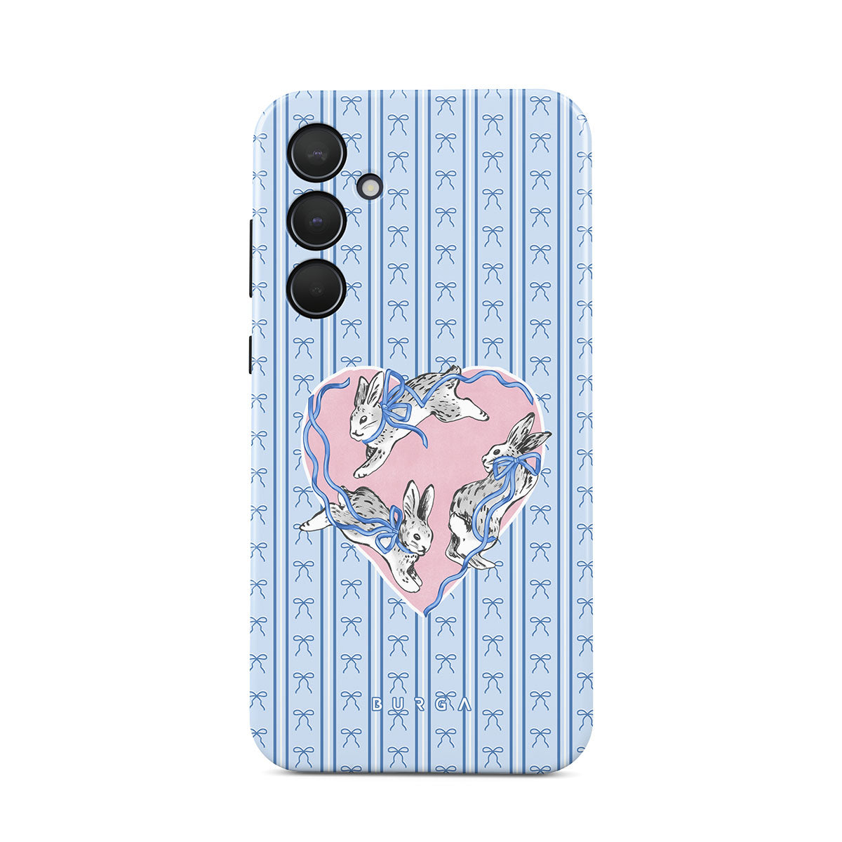 En este diseño: conejos blancos, marco de corazones, rayas azules.