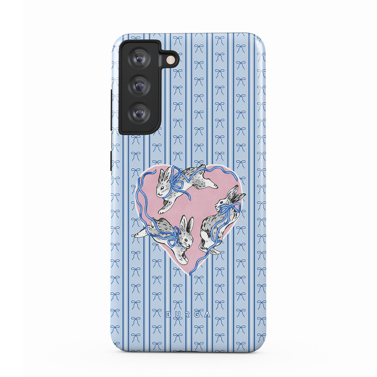 En este diseño: conejos blancos, marco de corazones, rayas azules.