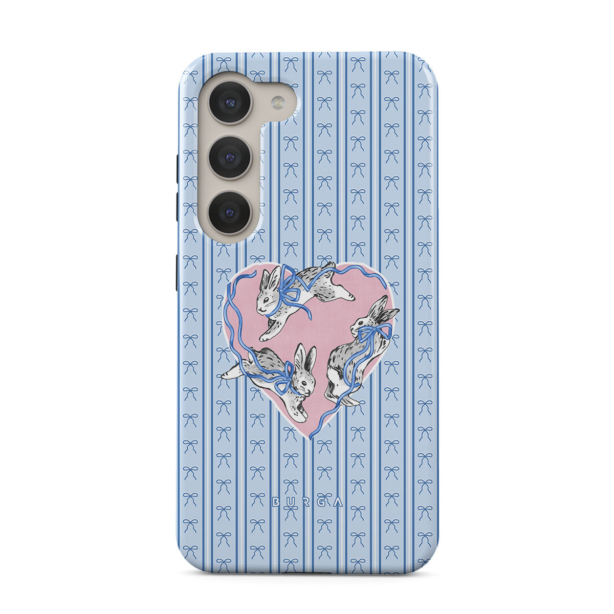 En este diseño: conejos blancos, marco de corazones, rayas azules.
