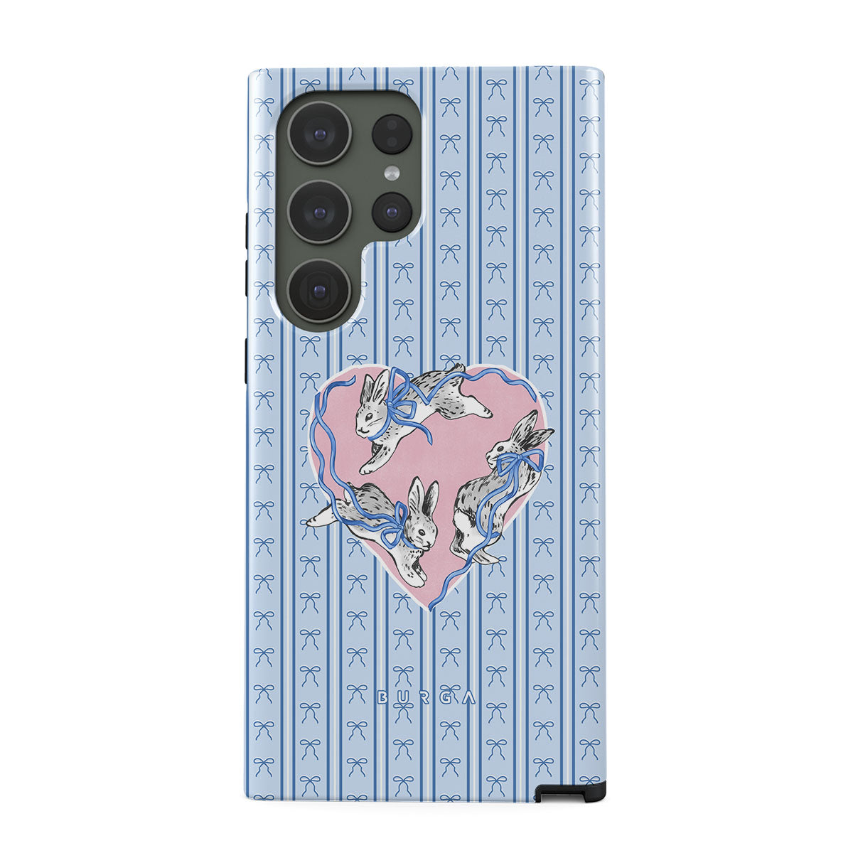 En este diseño: conejos blancos, marco de corazones, rayas azules.