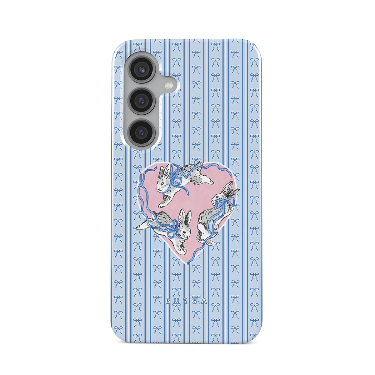 En este diseño: conejos blancos, marco de corazones, rayas azules.