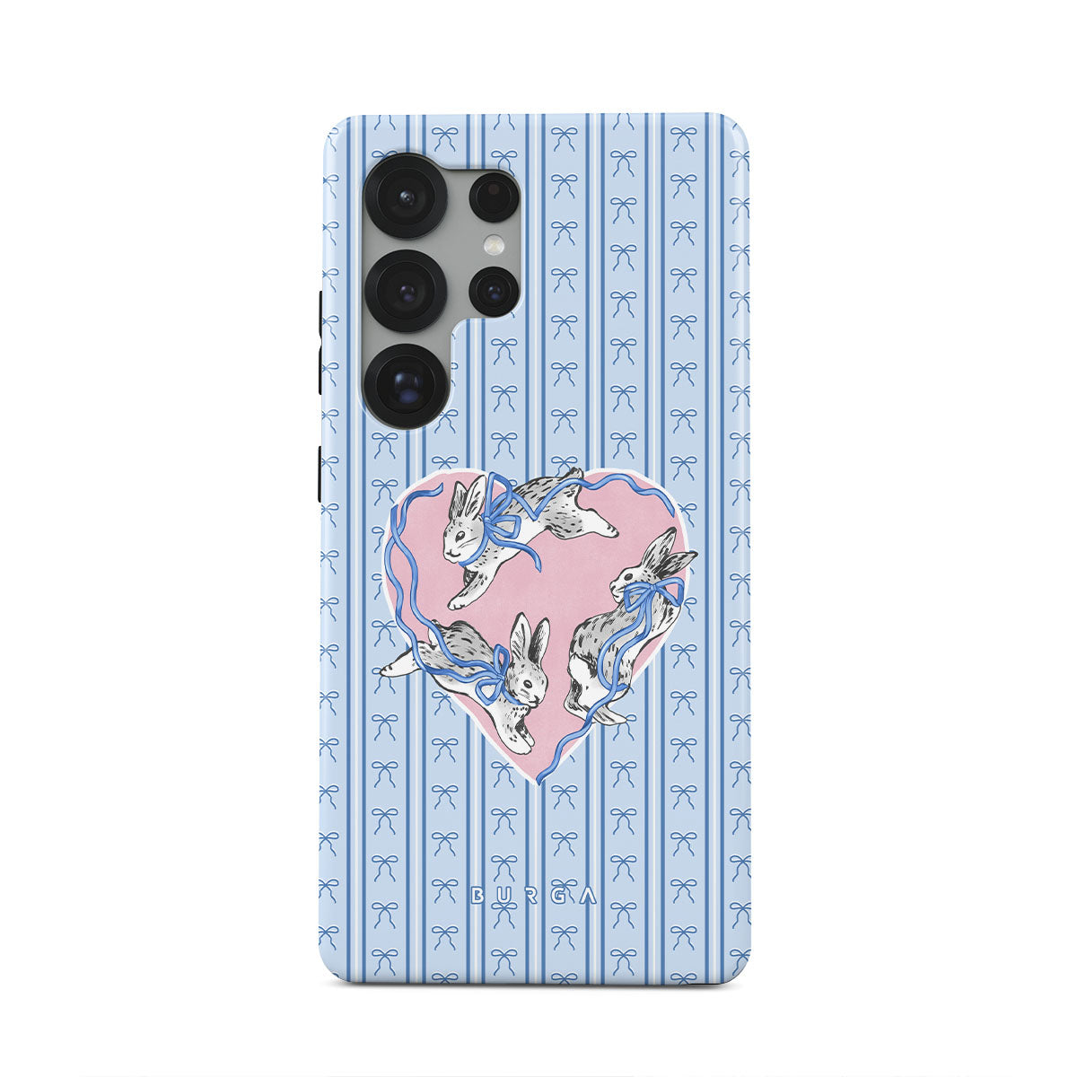 En este diseño: conejos blancos, marco de corazones, rayas azules.