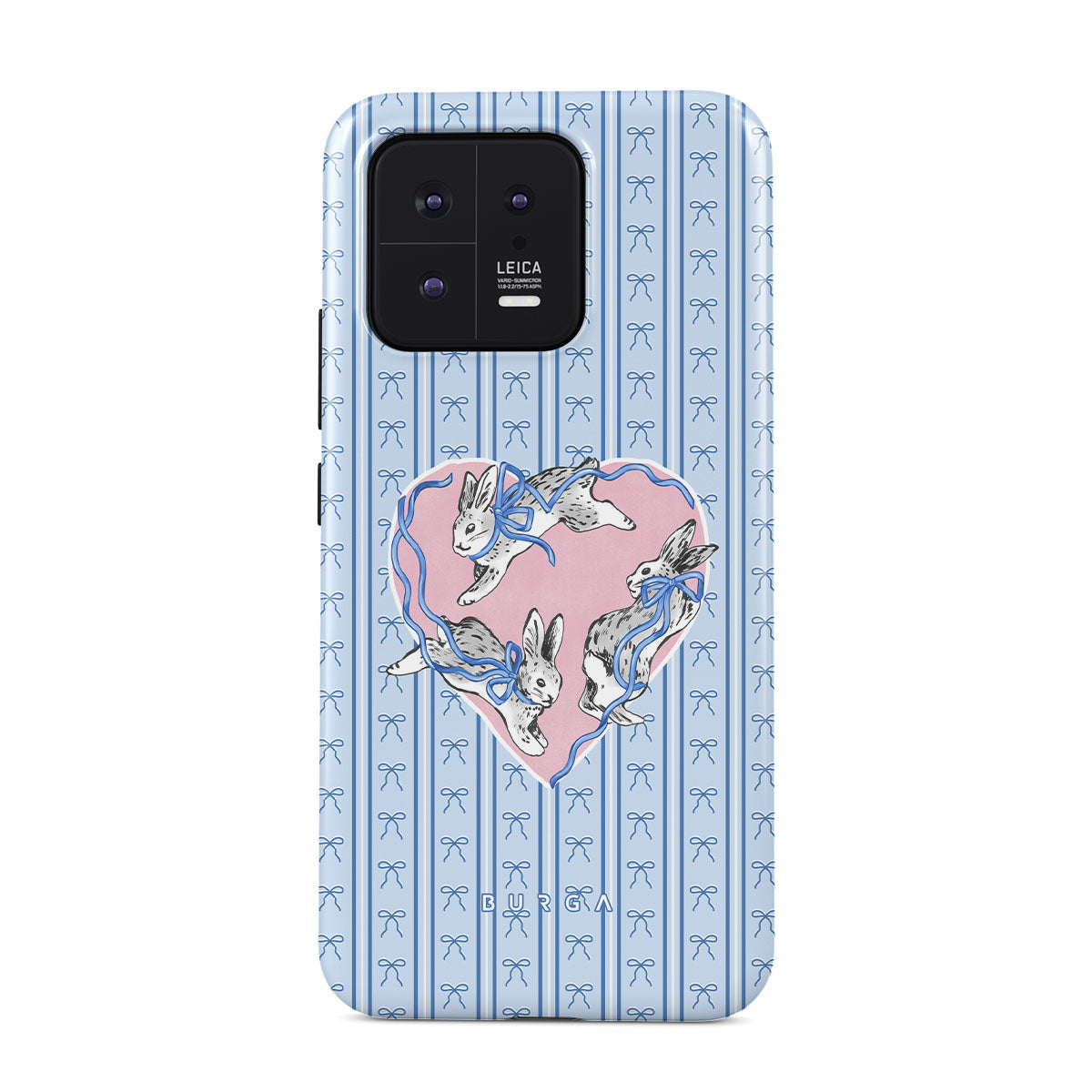 En este diseño: conejos blancos, marco de corazones, rayas azules.