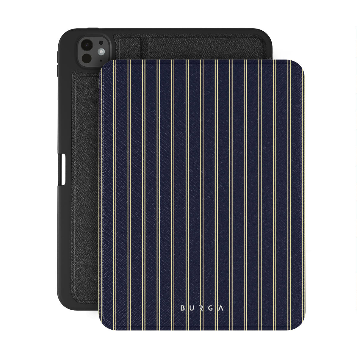 Características de este diseño: rayas azul marino, líneas doradas, líneas verticales, patrón geométrico
