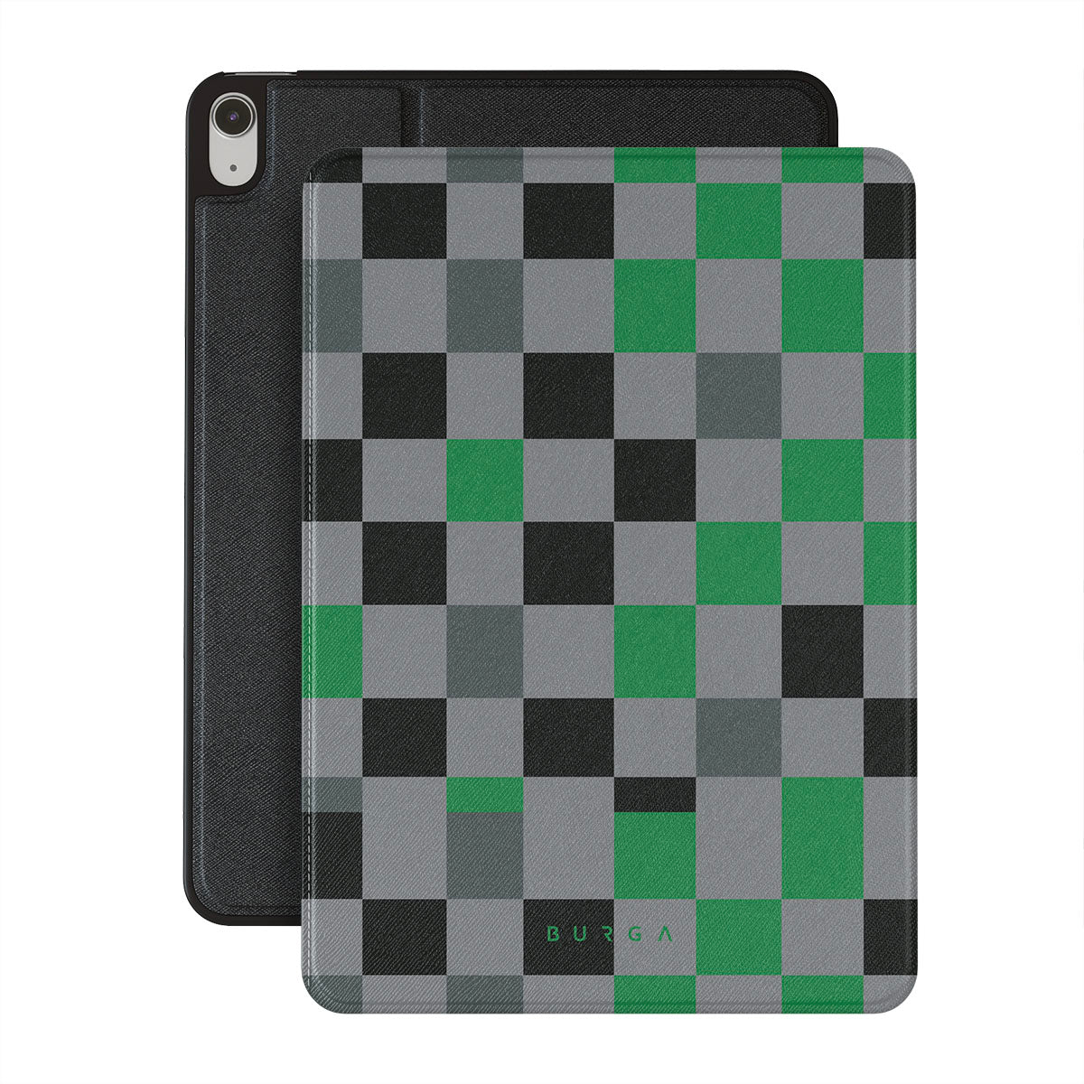 Características de este diseño: patrón a cuadros, verde, gris y negro, geométrico