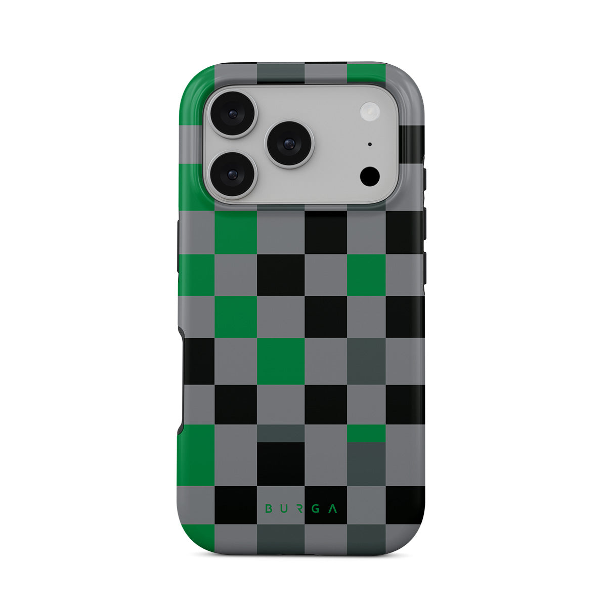 Características de este diseño: patrón a cuadros, verde, gris y negro, geométrico