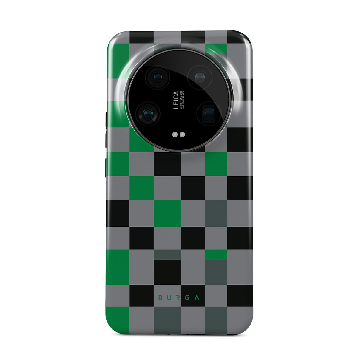 Características de este diseño: patrón a cuadros, verde, gris y negro, geométrico