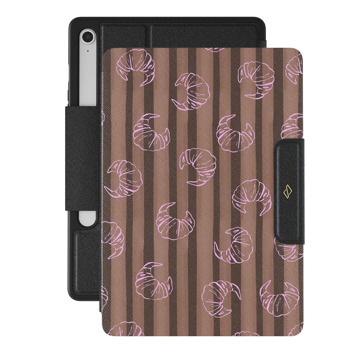 Características de este diseño: rayas verticales, rayas cafés y beige, croissants